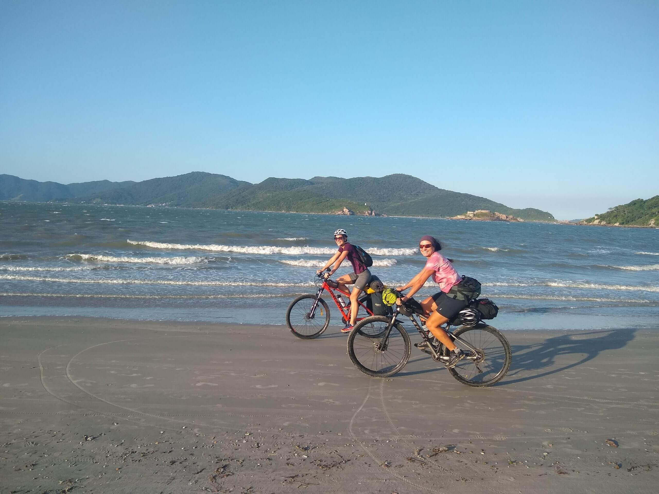 Em seguida, decidimos esticar a viagem até a praia do Gi, em Laguna, onde está a famosa Pedra do Padre, então pedalamos mais 60 km! Totalizando foram cerca de 180 km.
